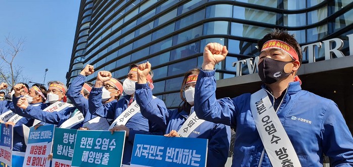 | ▲14일 일본대사관앞에서 수협와 한국수산업경영인중앙연합회, 한국여성어업인연합회 등 수산단체들이 후쿠시마 오염수의 방류 결정과 관련, 일본 수산물 전면 수입 중단 조치를 건의하는 등 다각적인 대응 활동에 나설 예정이라고 항의 규탄했다. |