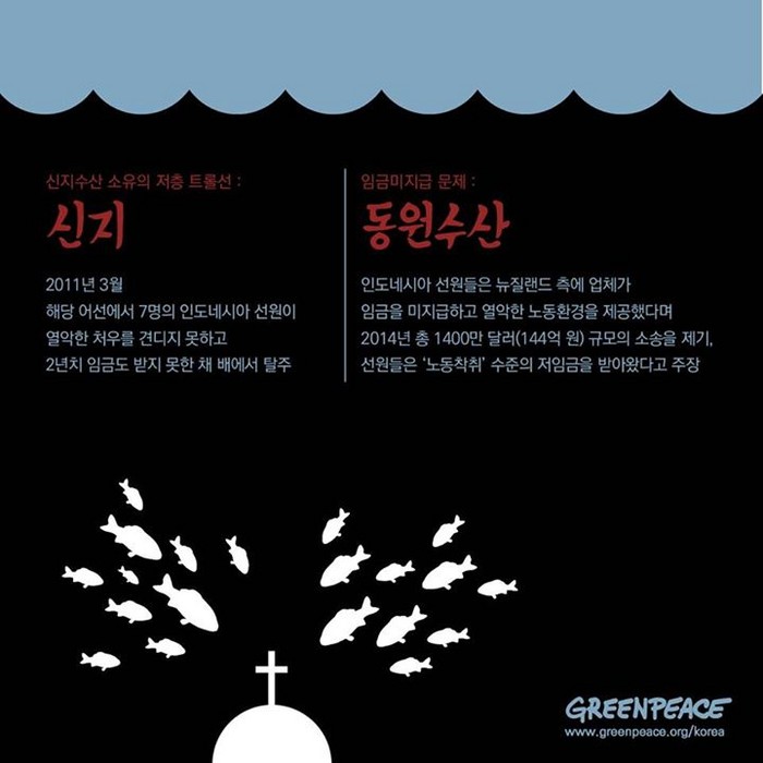 추악함 또 있다. 원양업계에 종사하는 선원들의 인권문제도 불법어업 행위의 주요한 사례 중 하나다. 망망대해에서 몇달 동안 배안에서 생활해야 하는 선원들은 폭력, 구타, 인종차별, 임금 착취 등이 늘고 있다.