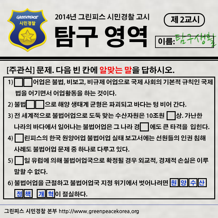 지난 주에 이어 '그린피스 시민경찰 고시' 2교시 탐구영역 문제는 '불법어업' 심각성을 고발하고 올바른 조업을 위한 바다 생태계를 지키기 위해 마련됐다.