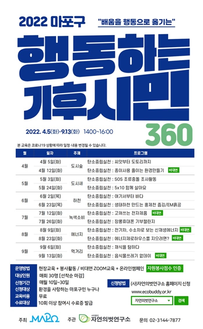 구는 12회 교육 중 10회 이상 참여하고 개인과제를 수행한 참여자에게 수료증을 배부하고, 현장 봉사 활동이나 온라인 캠페인을 진행한 참가자에게는 자원봉사 점수도 부여할 계획이다. 환경을 사랑하는 마포구민이라면 누구나 이번 프로그램에 신청할 수 있으며 교육비는 무료이다. 신청은 온라인을 통해 가능하고, 정원은 강의 당 30명이다.