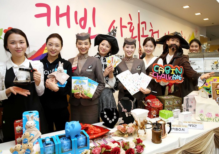 이날 행사에는 아시아나 캐빈승무원 봉사동아리 ‘B.O.A(Bread of Asiana)’ 및 차밍팀, 일러스트팀, 바리스타팀, 플라잉쉐프팀과 같은 기내 특화서비스팀 등 총 16개 동아리 및 특화팀 캐빈승무원 150여명이 참가, 바자회 물품 판매와 재능기부를 실시했다.