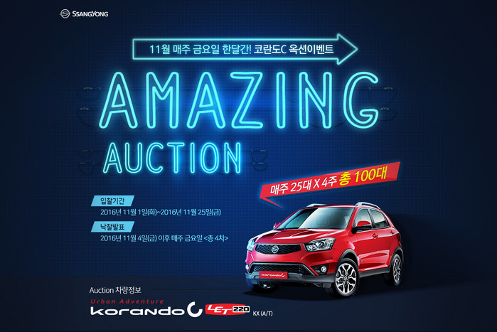 티볼리 슈퍼 프라이데이 옥션에 이어 실시하는 어메이징 옥션(Amazing Auction) 대상 차종은 코란도 C KX(A/T) 모델로 쌍용자동차 홈페이지를 통해 경매에 참여할 수 있다. 시작가는 정가의 50%로 책정되며, 매주 금요일에 마감하고 낙찰가는 정가의 90%를 넘지 않도록 제한한다.