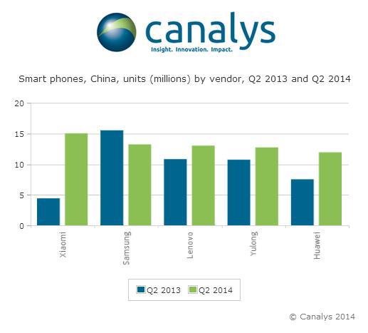 샤오미는 2013년 2분기 1.8%의 점유율에 그쳤지만 2014년 2분기에는 분기에는 점유율 5.1%를 차지하며 3.3%의 점유율 상승을 기록했다 .