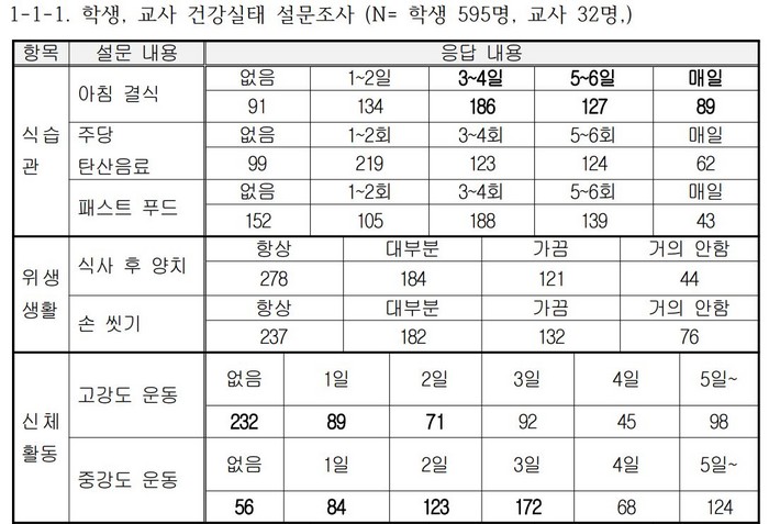 | ▲동대초등학교 연구결과, 학생들이 학교에서 꾸준하게 생활교육으로 진행한 결과수치다. |