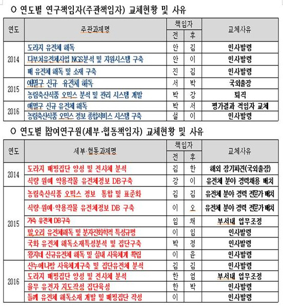 실제로 농진청은 2014년부터 2021년까지 총 669억원을 투입 '포스트게놈 다부처 유전체 사업'이라는 대형 연구개발을 진행 중이다. 이처럼 대규모 예산이 투입되는 대형 연구개발 사업의 경우 연구책임자의 역할은 더욱 중요할 것이나, 이 사업은 사업초기인 2014년에 3개 주관과제, 2015, 2016년에도 각 2개씩, 현재까지 총 7개의 주관과제 연구책임자가 교체됐다. 세부 협동책임자 교체도 2014~2016년까지 총 12명에 달했다.