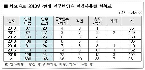2010년부터 현재까지 농진청의 R&D 연구책임자 변경횟수는 총 961회로, 2016년의 경우 192회로 2010년 65회에 비해 3배나 늘었다.