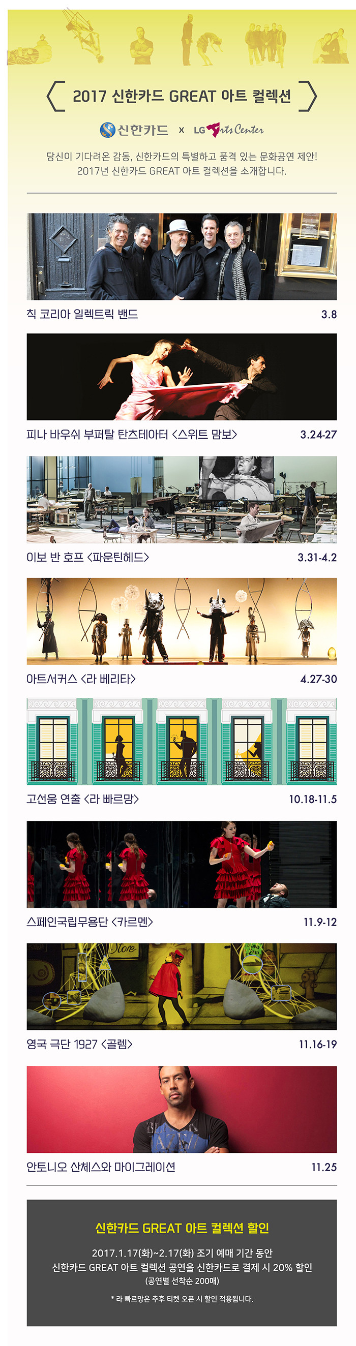 주제는 'GREAT 아트 컬렉션'은 신한카드와 LG아트센터가 다양한 문화 공연 가운데 희소성이 높고 우수한 작품을 발굴해 소개하는 신한카드의 공연 문화마케팅 브랜드다.