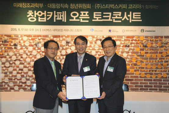 스타벅스는 17일 오후 3시부터 서울 대학로점 커뮤니티 스토어에서 스타벅스커피 코리아 이석구 대표이사와 미래부 이석준 제1차관, 청년위 홍두선 추진단장이 참석 창업 카페 프로그램 운영을 위한 업무 협약식을 진행했다.