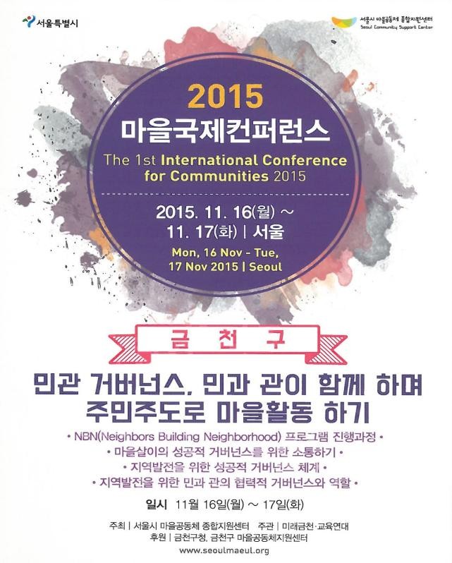 서울시 금천구는 11월 16일부터 17일까지 주민자치를 성공적으로 이끈 해외의 마을 전문가들을 초청해 지역발전을 위한 민관 협력적 거버넌스의 체계와 역할에 대해 이야기할 예정이다.