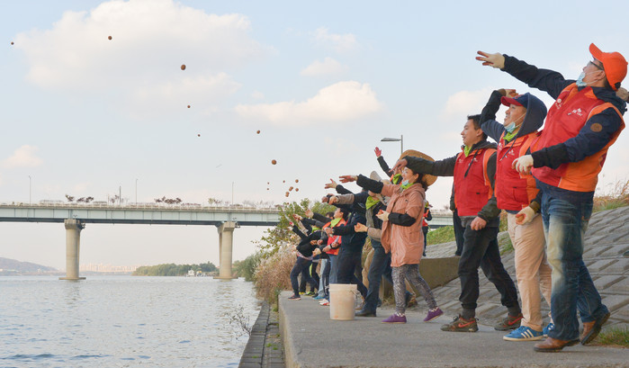 이날 SK C&C 구성원들은 수질정화 및 악취제거에 유용한 미생물이 들어있는 EM효소 발효액을 황토와 반죽해 만든 ‘EM흙공(Effective Micro-organisms)’ 2,000개를 광나루지구 한강에 투척했다.