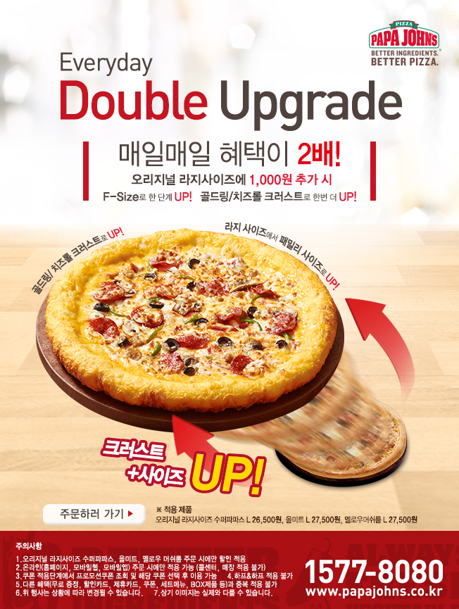 파파존스 피자를 가벼운 가격에 즐길 수 있는 더블 업그레이드 프로모션은 18일부터 적용되며 사이즈&크러스트 업그레이드의 두 가지 혜택이 함께 제공되는 것이 특징이다.