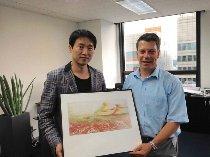 | ▲권두현 작가와 한국머크 그룬트 대표이사가 2016년 캘린더에 실린 작품을 선보였다. © 화학신문 |