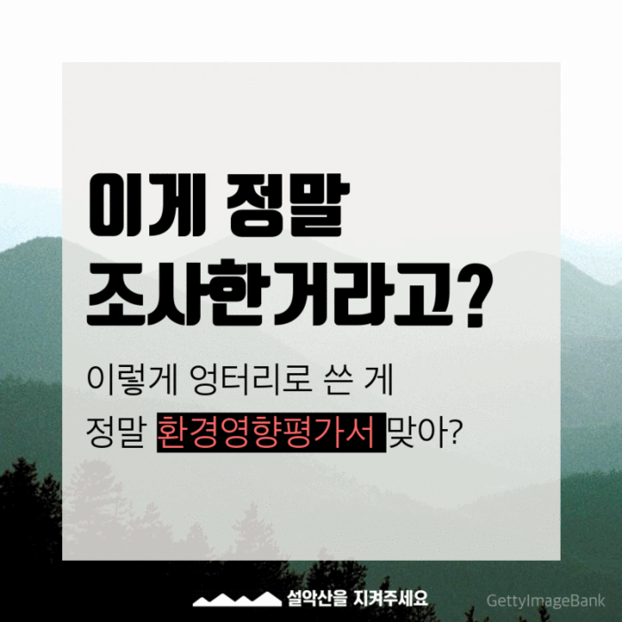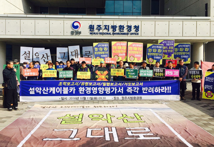 이들 단체는 최근 드러난 설악산 오색케이블카 환경영향평가서에서 거짓작성, 명의도용, 고의누락 등 명백한 반려 사유들이 나타났다며, 환경영향평가서를 심의 중인 원주지방환경청은 당장 반려해야 한다고 목소리를 높였다.