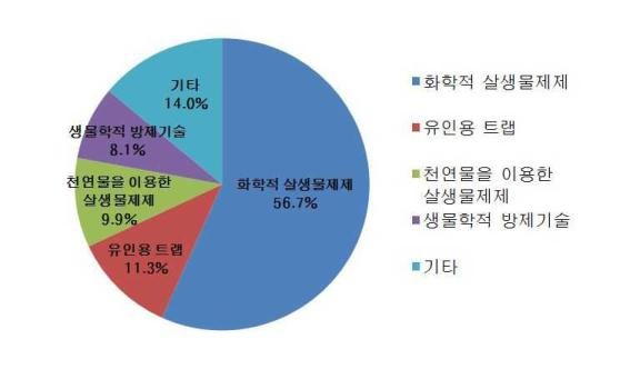 반면 환경 친화적 방제기술(유인용 트랩, 천연물 제제, 생물학적 방제)이 차지하는 비율은 급격하게 증가세를 보이고 있다.