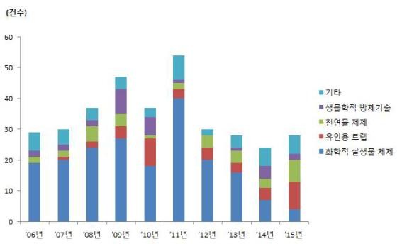 환경 친화적 방제기술 출원건수은 6건(’11년) → 8건(’12년) → 8건(’13년) → 11건(’14년) → 18건(’15년)으로 증가세를 이뤘다.