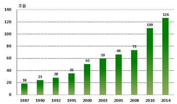 최초로 산림공익기능을 평가한 1987년(17조7000억 원) 보다 약 7배, 직전 평가인 2010년 기준 평가액(109조 원)보다 15.4%(약 17조 원) 증가했다.