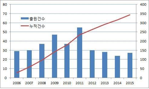 특허출원 건수로 보면 2006년 29건에서 2009년 47건, 2011년 54건 2013년과 2015년은 28건으로 꾸준하게 이어왔다.