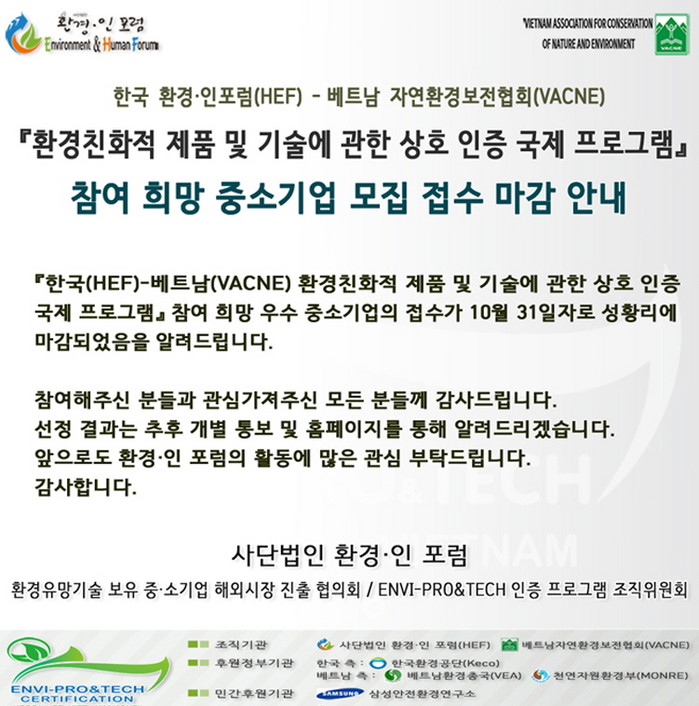 [화학신문 온라인팀](사)환경인포럼(회장 심재곤)과 베트남 자연환경보전협회(VACNE)가 공동으로 추진해온 환경친화적 제품 및 기술 관련 상호 인증 국제 프로그램에 참여할 국내 중소기업 신청이 10월말 마감됐다고 밝혔다.